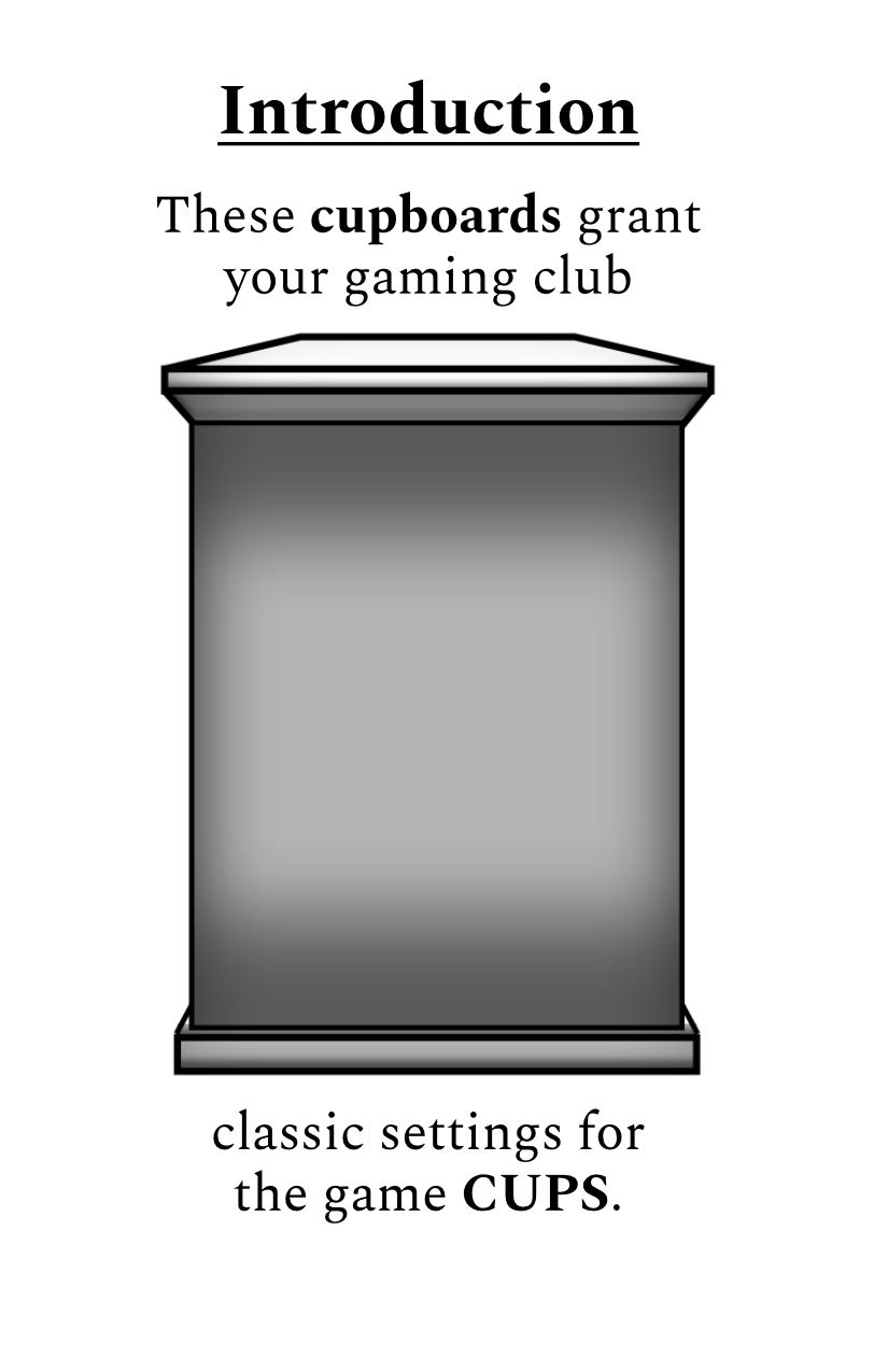 Introducing, Cupboards! Cupboards are a whole new way to store your CUPS - in other words, settings for CUPS adventures! This is CUPS' first 1st party supplement. There have been wonderful CUPS supplements made in the past, but this is the first time that one has been made by Chubby Crow Games.