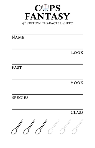 CUPS: Cupboards is a new series of supplements for CUPS that offer new rules for classic settings. This is the first volume: fantasy. It includes fantasy species, classes, rules for spells and special abilities, and a way to recuperate spoons! All tucked into 48 words in 4 simple, 12-word paragraphs.